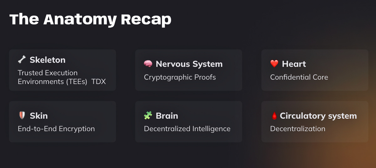 The heart: Confidential computing inside TEEs ensures no one can modify the agent or access sensitive prompts, inputs, or models.